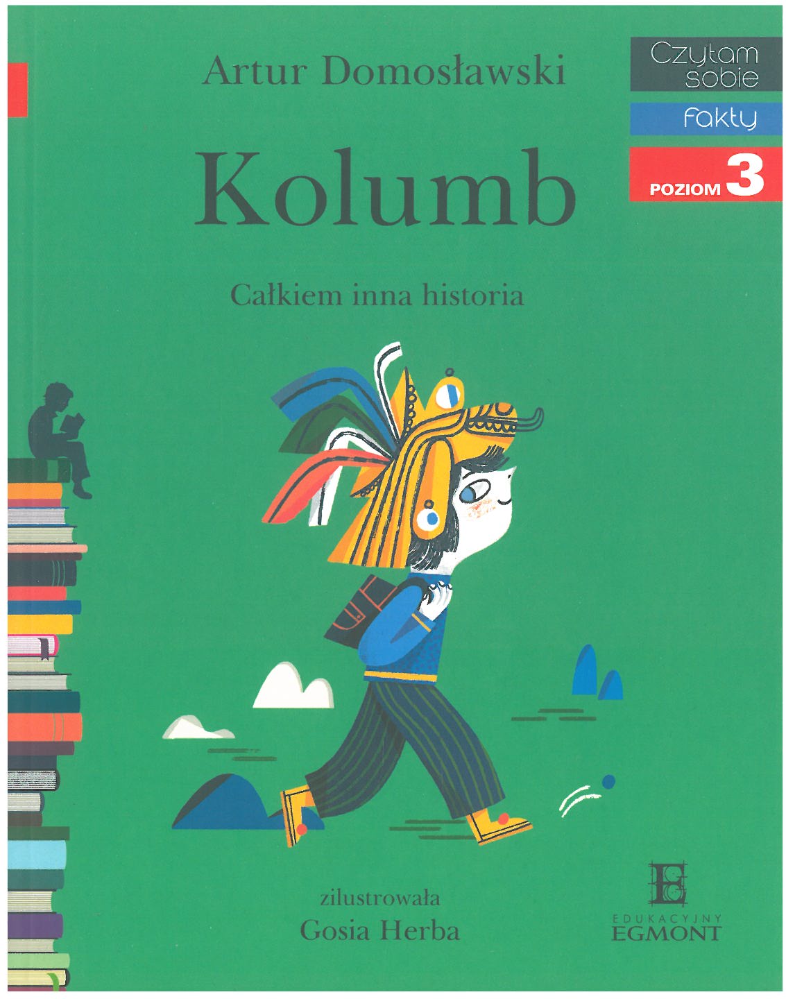 Ignaś dostał zadanie domowe – ma dowiedzieć się jak najwięcej o Krzysztofie Kolumbie. Tata Ignasia postanawia rozszerzyć historyczne horyzonty syna. Przedstawia mu swojego znajomego, rdzennego Amerykanina o tajemniczym imieniu Wiatr we Włosach. Mężczyzna opowiada Ignasiowi drugą, mniej znaną, mniej chlubną i niełatwą część historii o Krzysztofie Kolumbie. Ignaś po rozmowie z Wiatrem we Włosach już sam nie wie, co ma o tym wszystkim myśleć. - Czy Kolumb był bohaterem? - Czy powinno mu się stawiać pomniki? - Czy Krzysztof Kolumb był dobry czy zły? Wielką zaletą książki jest to, że oprócz samodzielnego czytania, uczy samodzielnego myślenia i krytycznego spojrzenia na historię. To dobra, wartościowa lektura, którą dzieci czytają z zaciekawieniem i zaangażowaniem. „Kolumb. Całkiem inna historia” Artura Domosławskiego, z ilustracjami Gosi Herby jest częścią bestsellerowej serii Egmontu „Czytam sobie”, która wspiera naukę czytania wśród dzieci w wieku 5-7 lat. Cykl podzielony jest na trzy poziomy zaawansowania. „Kolumb. Całkiem inna historia” to książeczka historyczna na poziomie 3. [Wydawca]